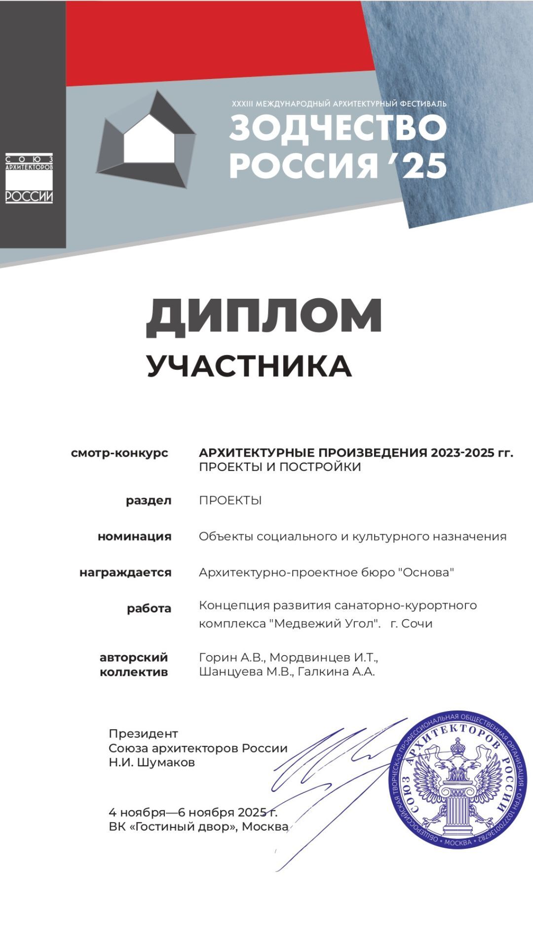 Дипломант смотра-конкурса Международного фестиваля Зодчество 2025 "Архитектурные произведения 2023-2025 гг." в номинации "Объект социального и культурного назначения"