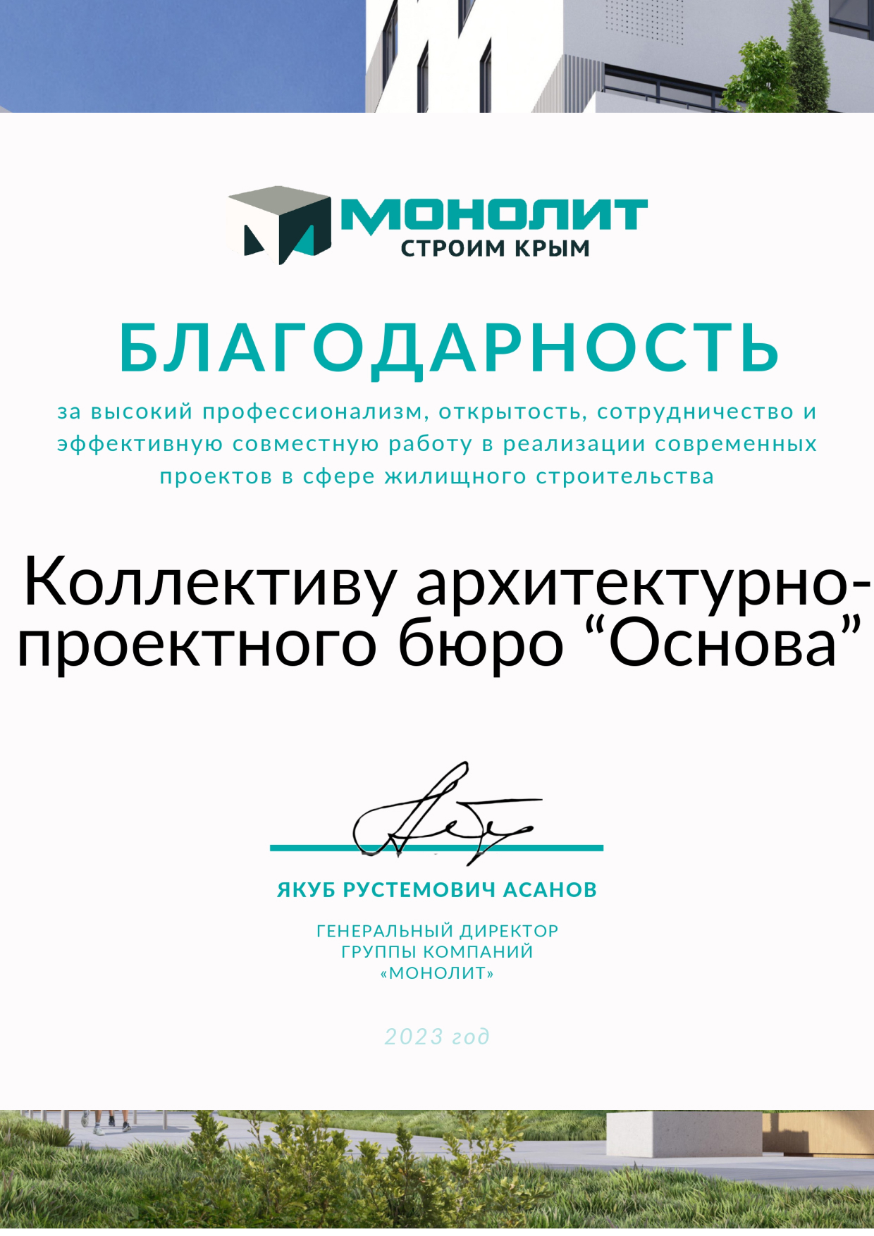 Благодарственное письмо от Группы Компаний "Монолит" для АПБ "Основа"